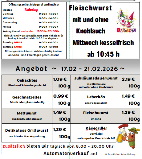 Montags kein Thekenverkauf in der Fleischerei!!!!
